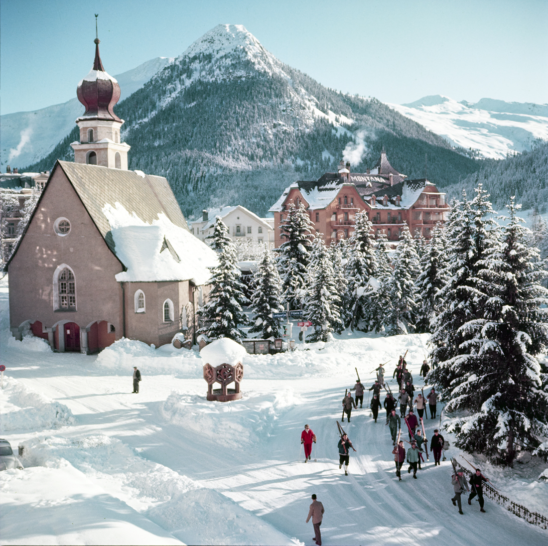 Skiiers walk past a snowcovered church, Klosters, Switzerland, 1951. (Toni Frissell)