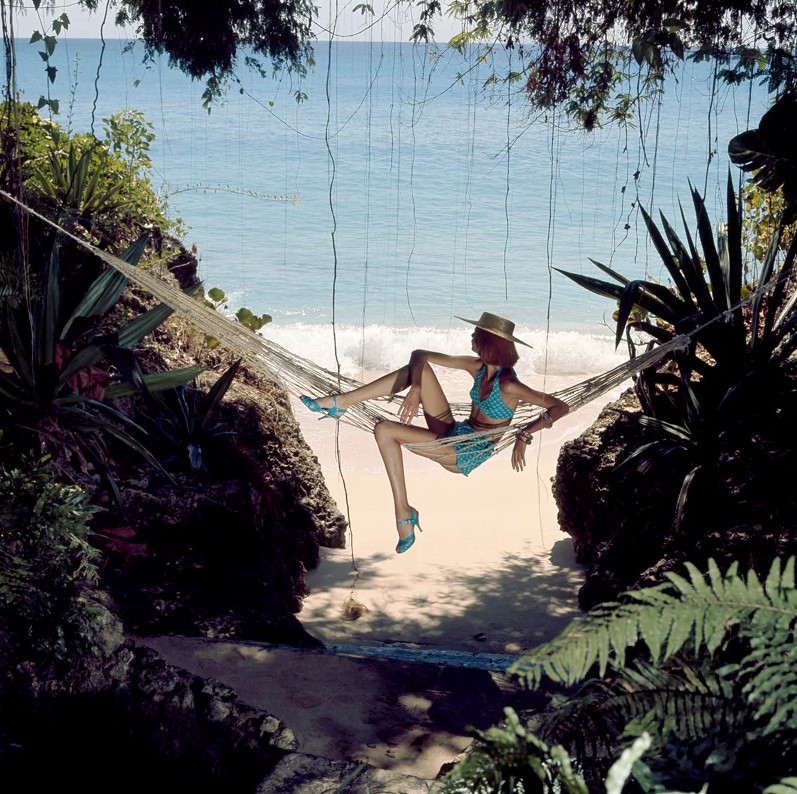Fashion model Apollonia van Ravenstein, photographed for Vogue magazine by Norman Parkinson in Barbados, 1973.