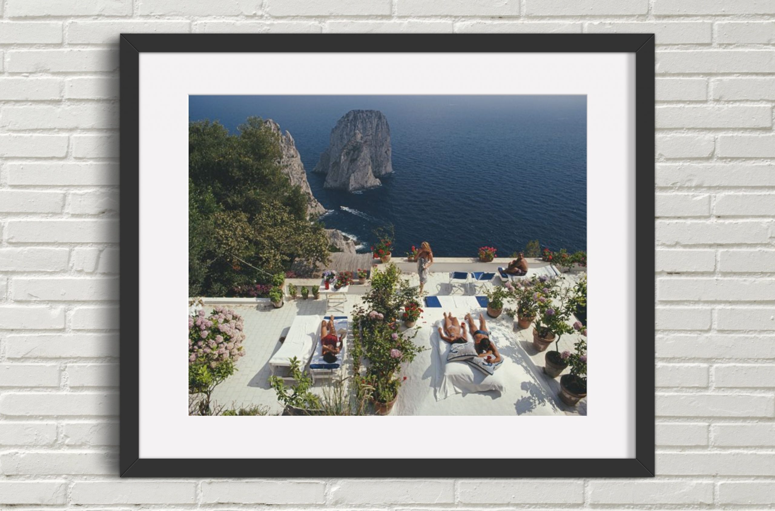 Note this image is available as an Open Edition or Limited Edition Estate Stamped Print (edition size 1/150). Sunbathers lounge on the white-painted terrace of Il Canille, built into the rocks of Pizzolungo overlooking the waters off the coast of the island of Capri, Italy, in August 1980. Il Canille is the villa owned by Italian tailor and fashion designer Umberto Tirelli (1928-1992).