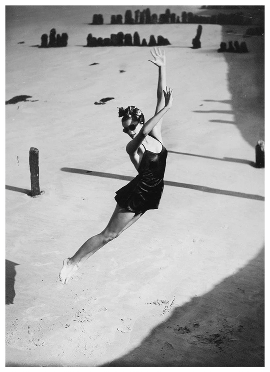 Pamela Minchin is photographed on the Isle of Wight wearing Fortnum and Mason’s dark burgundy Lastex satin swimsuit with a ballet skirt during a July 1939 photoshoot for Harper’s Bazaar. Parkinson’s work revolutionized the world of British fashion photography in the 1940s by bringing models from the rigid studio environment into a far more dynamic outdoor setting..