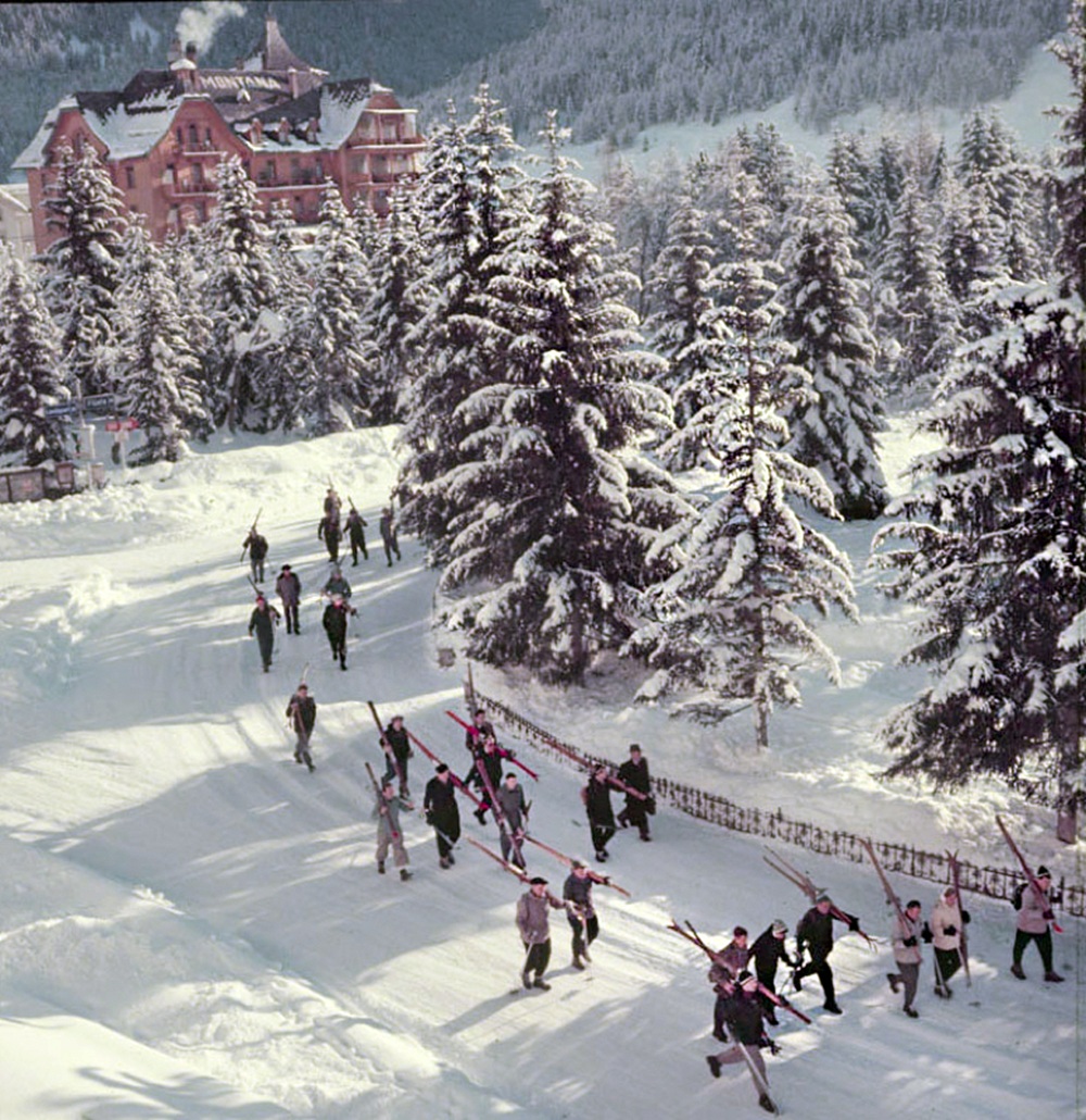 A group of skiers walk through the street on their way to the ski runs, Klosters, Switzerland, 1954. (Toni Frissell)